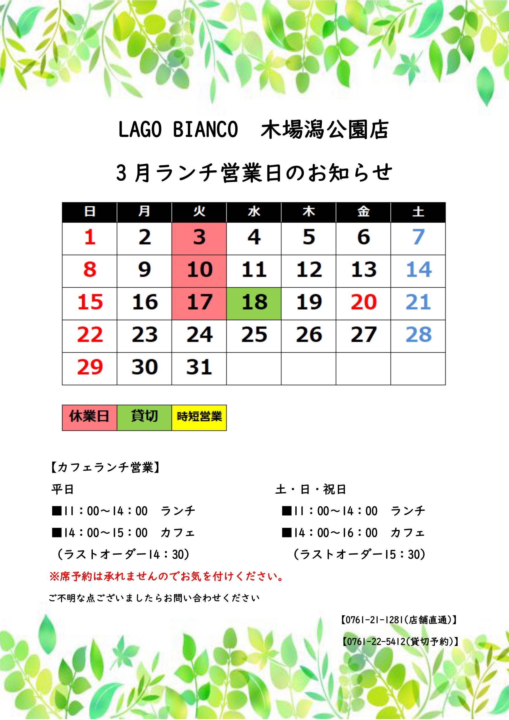【木場潟店】2月営業日のおしらせ