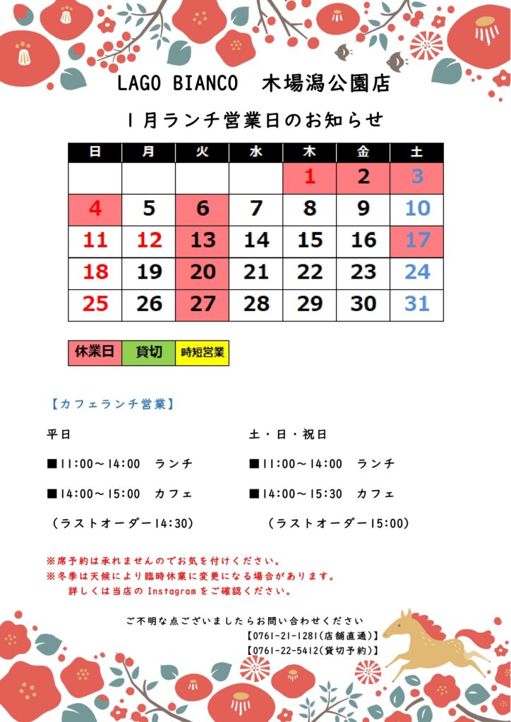 【木場潟店】1月営業日のおしらせ