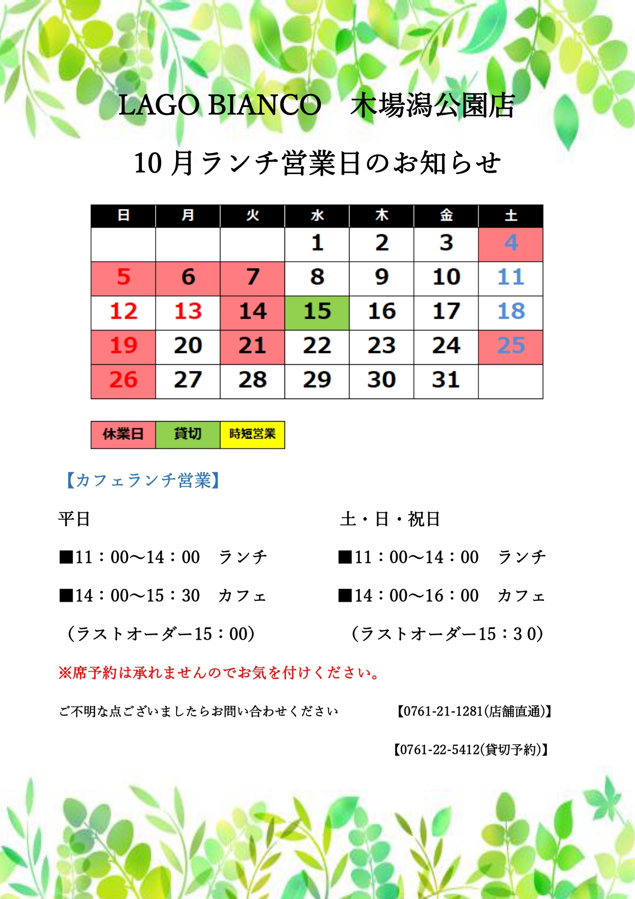 【木場潟店】10月営業日のおしらせ